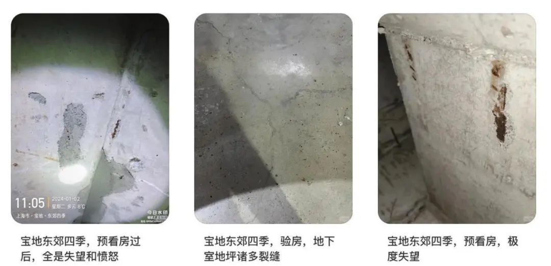 其中有业主称,宝地东郊四季预看房过后,全是失望和愤怒,验房验的都是惊吓。据其描述,项目阁楼钢筋裸露,施工木板未拆卸,车库简陋,地面都是裂痕,地下室地坪诸多裂缝,且存在漏水,精装房、窗户、马桶、墙面…诸多毛病数不胜数。