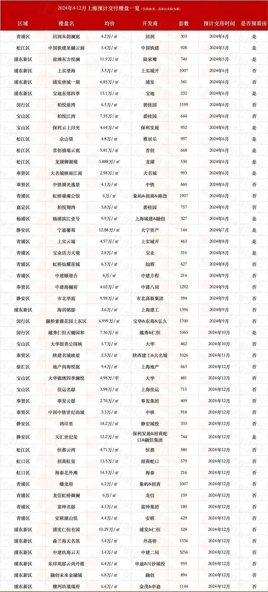 据凤凰网房产不完全统计,今年接下来,上海预计还有49盘将迎来交付,涉及到的开发商有招商、碧桂园、金茂、中铁、保利发展等,截止到目前,已有多个楼盘已邀请业主预看房。