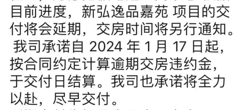 而到了2024年1月16日,项目再次通知业主,“无法交付,延期交付,时间待定”。不过据悉,这一次延期,开发商是要承担违约金的。