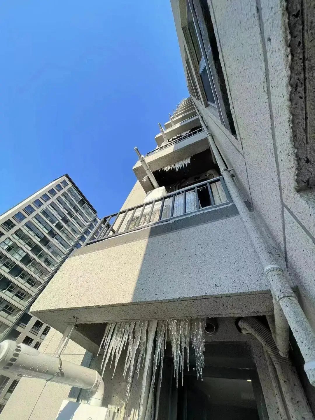 不少楼栋北面的户外设备台从上到下挂满冰凌,而由开发商统一安装在户外的壁挂炉更是“摊上了大事”。