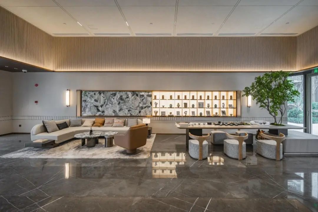 项目的入户大堂也下足了功夫,哑光色拉丝不锈钢与仿石材砖墙面,透着简约而精致的格调,景墙上的折线石材典雅高贵、吊顶的磁吸轨道灯具百变灵动,格调直接拉满。