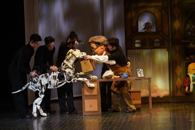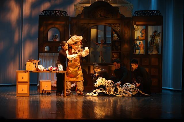 《玩偶修理铺》的故事主人公首次使用双人穿戴大偶作为创新木偶表演形式。适度夸张的双人穿戴大偶对演员操控木偶的协调性、准确性有极高的要求。而整场戏最吸睛的当属斑点狗“多乐”了,其造型设计新颖、灵动,在三位演员的灵活操控下,栩栩如生,赢得了现场大小观众阵阵呼声。