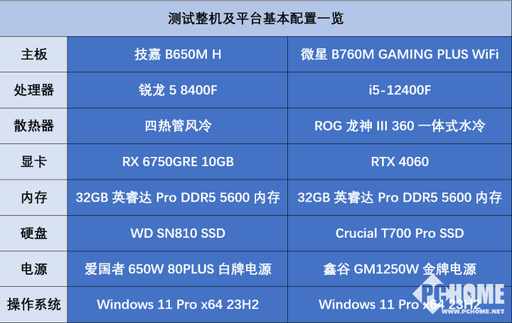 而在竞品平台的选择上,我们则是组装了一台配置为i5-12400F+RTX 4060的测试平台来模拟这一价位段最常见的整机配置,主板采用了主流整机常用的微星B760M GAMING PLUS WiFi。此外我们将两套平台的内存统一为双通道32GB DDR5 5600MHz的英睿达Crucial Pro DDR5内存超频版,确保内存的容量和性能不会影响其他硬件的性能释放。