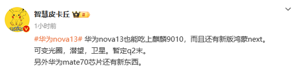 【CNMO科技消息】4月18日,CNMO注意到,爆料人士“智慧皮卡丘”放出了华为nova13系列的最新消息。