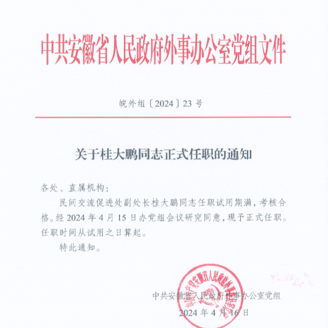 据安徽省人民政府外事办公室官网文件显示,桂大鹏,民间交流促进处副处长,任职试用期满,现正式任职。