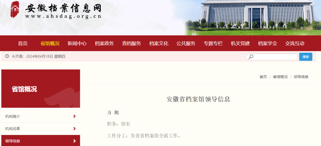 据安徽省档案馆官网“领导信息”更新显示:方旭已任安徽省档案馆馆长。此前,黄玉明任省档案局党组书记、省档案馆馆长。