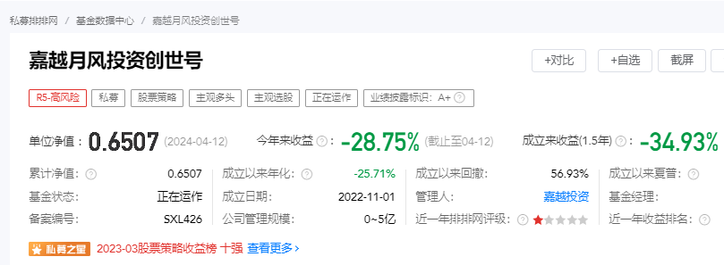 而其吐槽的产品,名为“嘉越月风投资创世号”。私募排排网显示,这是吴悦风目前仍在管理的唯一一只基金。该基金成立于2022年11月,风险等级为R5-高风险,预警线为0.75,止损线为0.7。