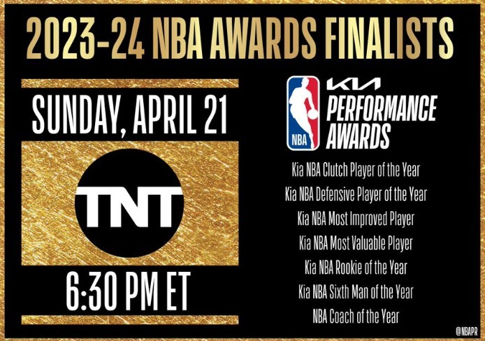 NBA官方宣布,2023-24赛季NBA常规赛最佳球员的七个奖项的最终入围名单将于美国东部时间4月21日星期日下午6:30(北京时间下周一)揭晓。