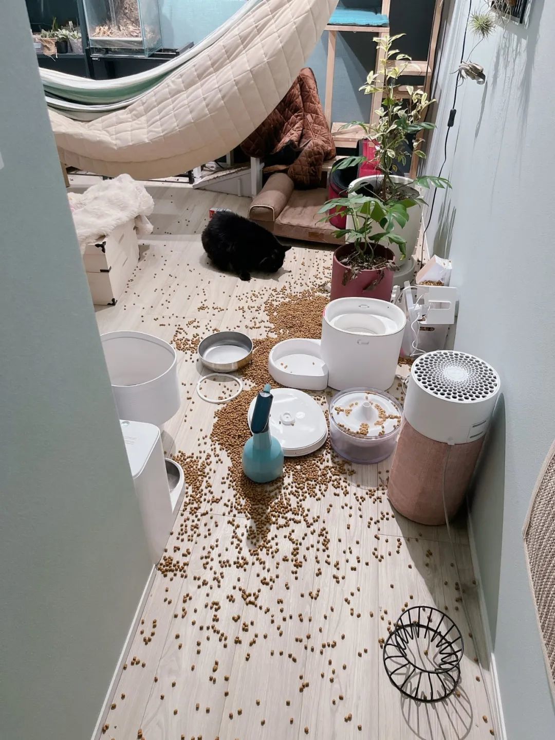 真正的原因是逆子在家跑酷时把喂食器给撞翻了,粮粮洒了一地