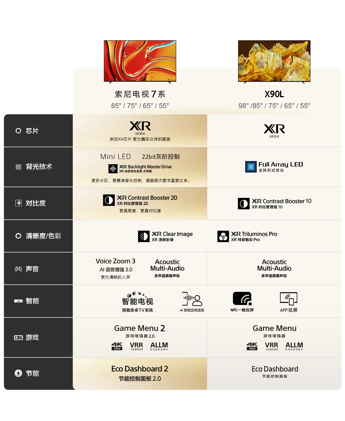 作为此前 X90L 的继任者,索尼电视 7 系去掉了 98 英寸的版本,升级了 XR 芯片、Mini LED 背光和节能控制面板 2.0,并得到了更加的对比度与亮度。