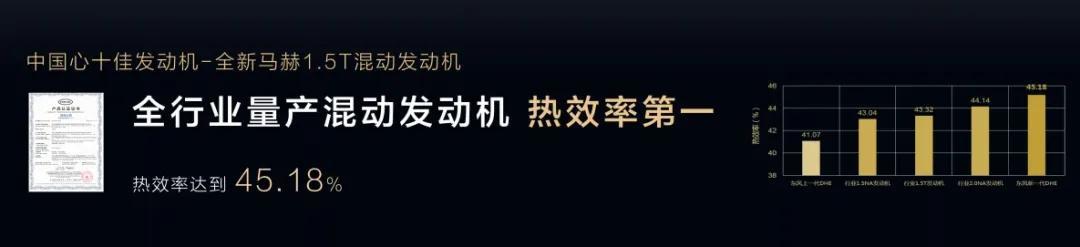 动力方面最为显著,马赫电混 PHREV可纯电,可混动,可增程,包括马赫E“10合1”电驱系统、行业内挡位最多的4档DHT混动专用变速箱,热效率高达45.18%的全新马赫1.5T混动发动机,这是行业唯一已量产,并且经过权威认证热效率突破45%的混动专用发动机,同行中位居一流。