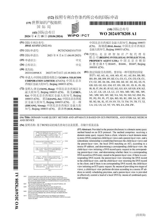 证券之星消息,根据企查查数据显示中国电信(601728)公布了一项国际专利申请,专利名为“基于ECS协议的域名查询方法及装置、存储介质及设备”,专利申请号为PCT/CN2023/117333,国际公布日为2024年4月18日。