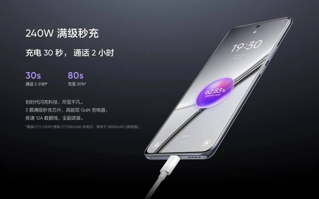 目前 OPPO 集团已经产品化的最高闪充速度为真我 realme GT Neo5 与 GT5 手机搭载的 240W(20V 12A)满级秒充,80 秒即可充入 20% 电量。
