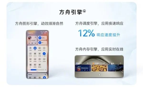 方舟引擎:方舟图形引擎,动效顺滑自然;方舟调度引擎,应用疾速响应,响应速度提升 12%;方舟内存引擎,应用实时在线。