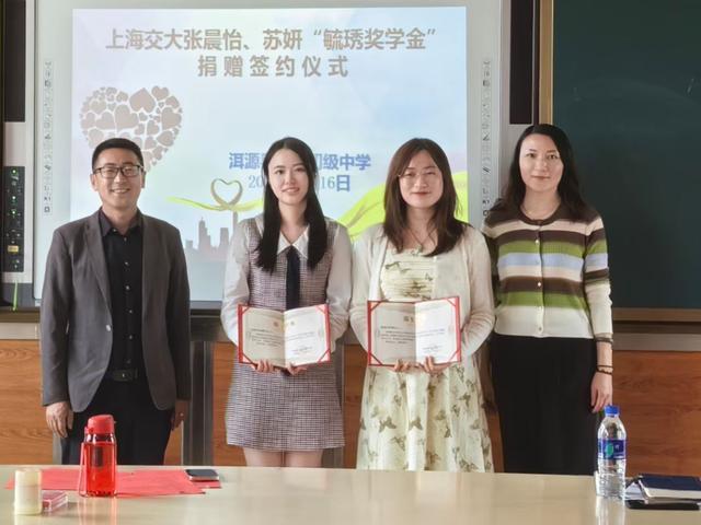同一时间,大理白族自治州洱源县玉湖初级中学(下称“玉湖中学”)会议室里,“毓琇奖学金”捐赠签约仪式正在举行。为洱源娃设奖的,正是刚刚从上海交通大学凯原法学院硕士毕业的张晨怡、苏妍。