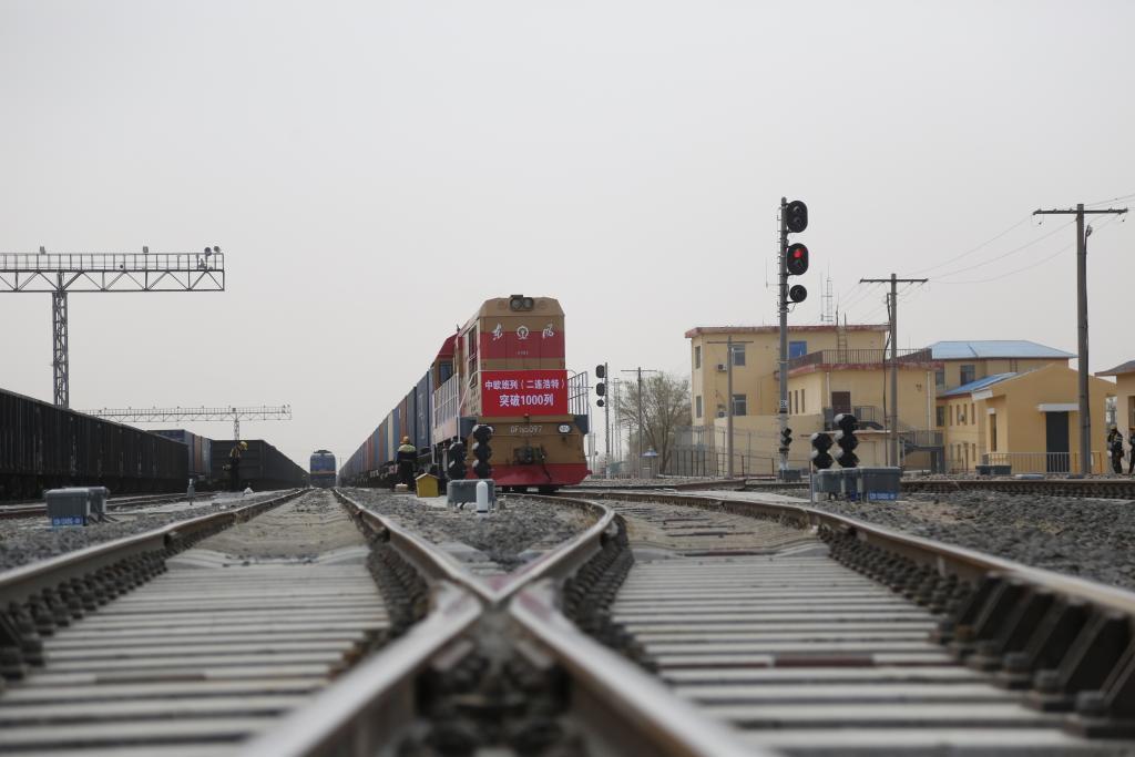 4月21日,一列满载55个标箱的中欧班列从二连浩特铁路货场顺利发车,标志着今年以来二连浩特铁路口岸出入境中欧班列突破1000列。