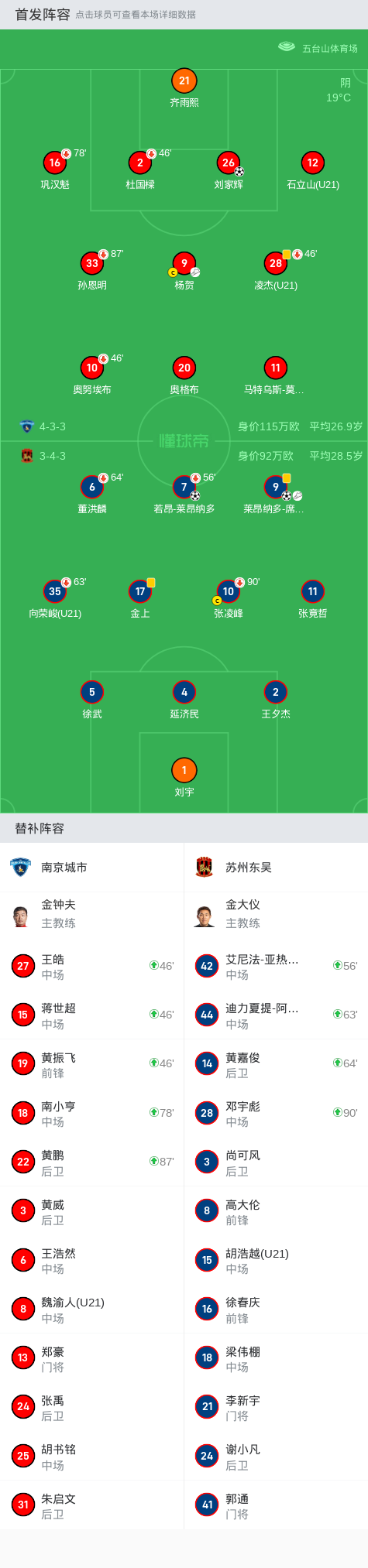 苏州东吴首发:4-延济民, 9-莱昂纳多-席尔瓦, 2-王夕杰, 7-若昂-莱昂纳多, 1-刘宇, 10-张凌峰, 17-金上, 6-董洪麟, 11-张竟哲, 5-徐武, 35-向荣峻