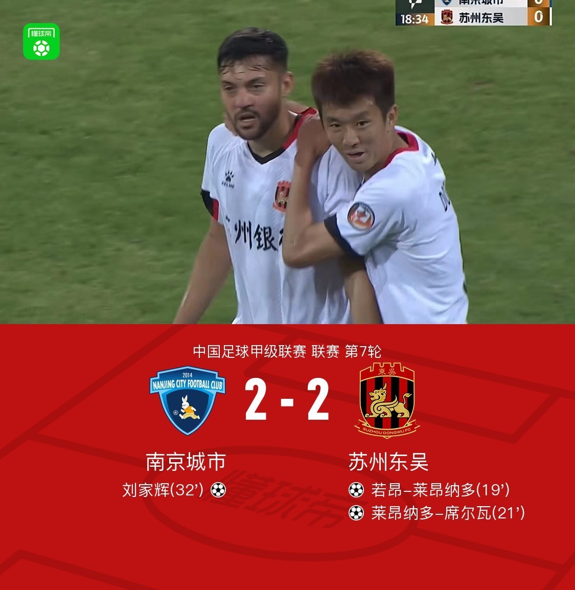 北京时间4月21日中国足球甲级联赛 联赛 第7轮,南京城市主场对阵苏州东吴。上半场,莱昂纳多-席尔瓦传射建功,若昂-莱昂纳多破门;下半场,刘家辉破门外加补时造点,奥格布点射扳平。最终南京2-2逼迫苏州。
