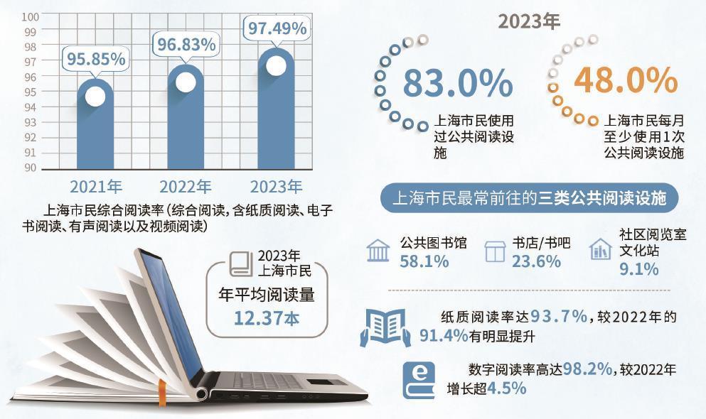 2023年上海市民综合阅读率达97.49%,人均阅读超12本;市民纸质阅读覆盖率和阅读时长双双提升,数字阅读率达98.20%,已成主流阅读方式;83.0%的上海市民使用过公共阅读设施;69.0%的上海市民至少参与过一项线下阅读活动……昨天,《2023上海市民阅读状况调查》在2024年世界读书日上海全民阅读主题活动上披露了一组亮眼的数据。
