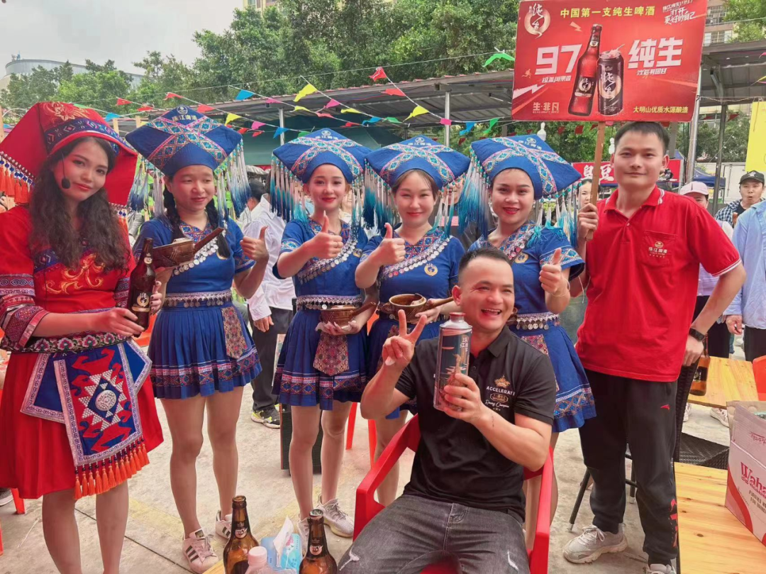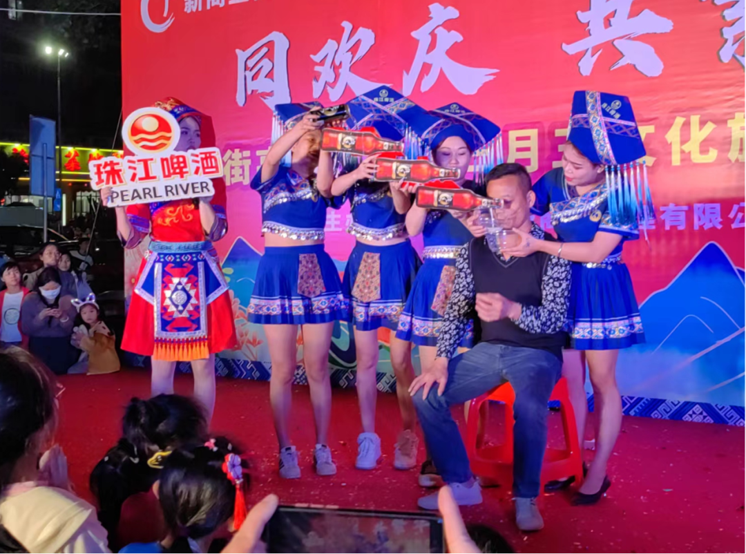 “高山流水”是广西当地一种酣畅淋漓的美酒喝法,源源不断的酒水沿着参差的碗碟流淌下来,宾客开怀畅饮,气氛喜庆热烈。广西珠江啤酒结合民俗特色活动,打造好吃、好玩、好新鲜的特色街区,活动现场啤酒美食琳琅满目,处处萦绕着极具民族特色的歌声,广大游客通过互动式、沉浸式体验,开启啤酒与民俗活动的奇妙之旅。