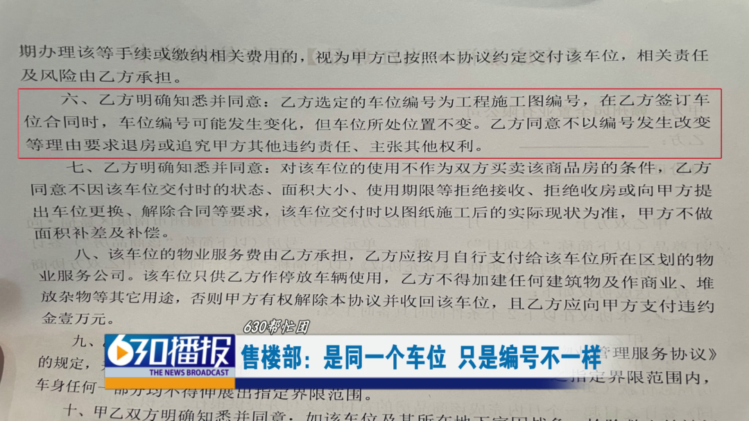 此外,工作人员介绍,除了发给业主“车位抵用尊享券”,他们当时也跟胡先生签了《配车位协议书》,在协议书上第六条明确写明“乙方选定的车位编号为工程施工图编号,在乙方签订车位合同时,车位编号可能发生变化,但车位所处位置不变”。