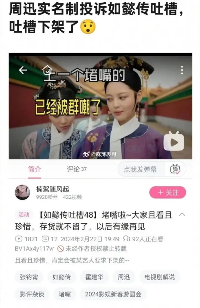 影视UP主们也嗅到了流量密码,开始大规模花样产出。其中一位做精神分析的UP主出视频认为,《如懿传》的内在逻辑是推卸一切责任。该视频火了以后,遭到了周迅工作室的实名投诉。和此前蔡徐坤的“鸡你太美”事件如出一辙,明星捂嘴引发了B站群众的“保路运动”。燎原之火一触即发,攻陷了周迅工作室评论区。