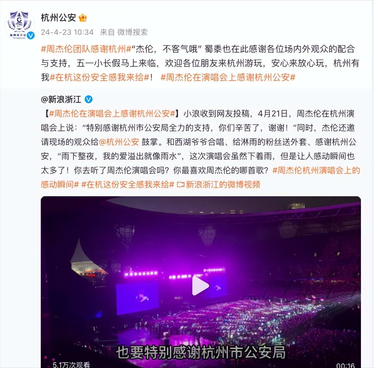 23日,杭州公安发文回应:“杰伦,不客气哦。蜀黍也在此感谢各位场内外观众的配合与支持,五一小长假马上来临,欢迎各位朋友来杭州游玩,安心来放心玩,杭州有我。”