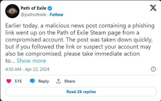 大意:“今天早些时候,来自被盗号的《流放之路》Steam 页面上出现了一条包含网络钓鱼链接的恶意新闻帖子。该帖子很快被删除,但如果您点击该链接或怀疑您的帐户也可能遭到泄露,请立即采取行动以保护您的帐户。”