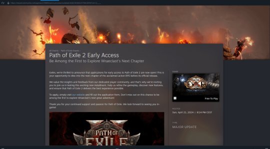 就在上周末,正如外媒MMO Fallout最先发现了这一情况,《Grinding Gear Games》工作室在Steam上公开了《流放之路2》的内测申请,或者我们曾经这样认为。开发商对此事发表了如下声明: