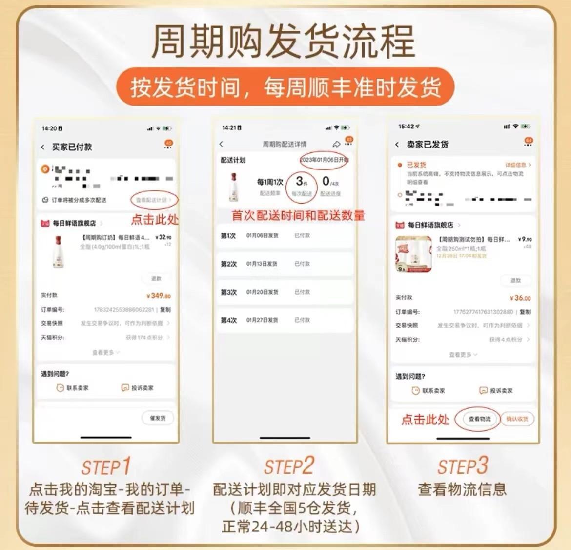 用户通过自主下单4期、12期、24期、48期的产品,一次下单即可享受周期性订购服务,结合官方订奶平台“天鲜配”,进一步开拓购买自由度。