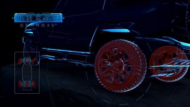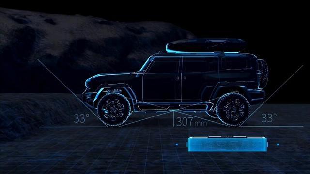 越野物理参数上,山海T7的接近角为33度,离去角33度,最小离地间隙307mm。同时提供后轮6度的转向,进一步的减小转弯半径。