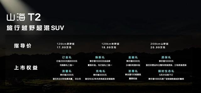 此次公布了山海T2的价格区间为17.99-20.99万元(以旧换新价16.49-19.46万元),共推出三款车型,其中两款纯电续航129km,顶配车型为208km。而目前这三款车型采用前驱,但整车离地间隙、涉水深度等物理参数要明显强于主流城市SUV,相对来说更适合轻越野。其四驱车型也将在几个月后上市销售。