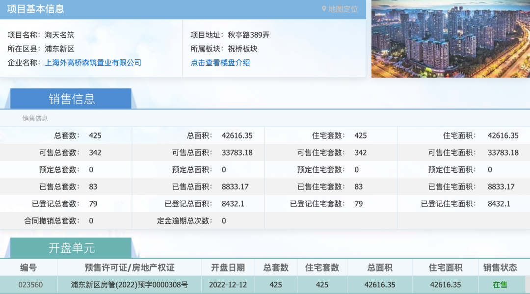 地块周边新房有森兰海天名筑,项目于2022年12月12日首开,共推出425套房源,目前网上房地产显示,项目可售房源还有342套,网签去化约20%,平均每个月售出约5套房。