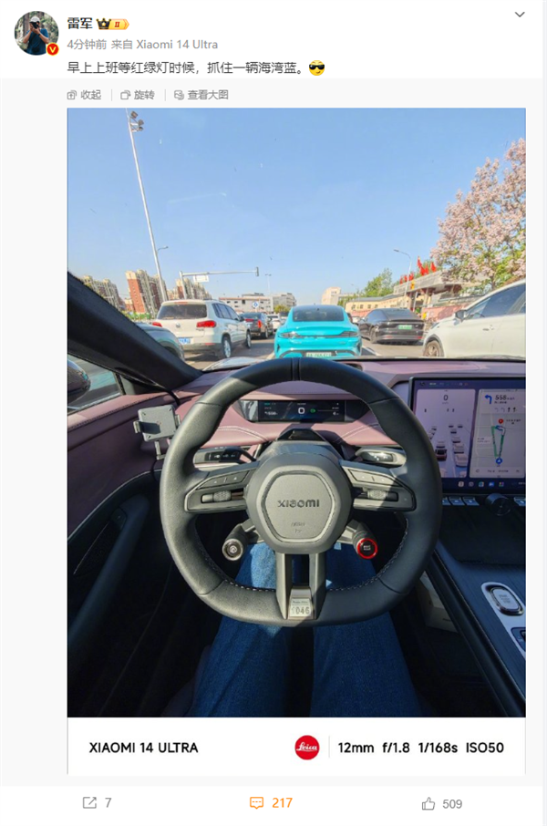 照片捕捉了一个日常场景:雷军在等待红绿灯时偶遇了小米SU7,而其独特的海湾蓝色在传统的黑白灰车流中显得格外醒目。