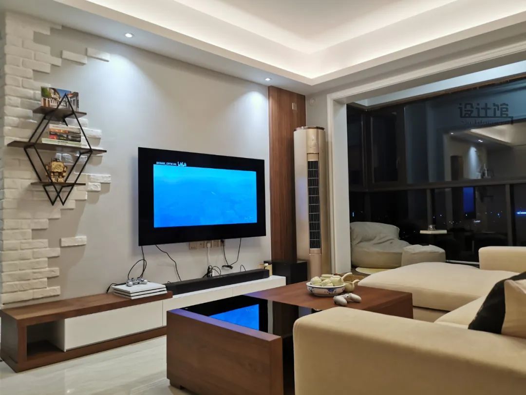 具体摆在电视墙还是沙发墙一侧,还要考虑空调外置的安装位置,在不影响空间(电视墙或沙发墙)布局的前提下,尽量让内机摆在靠近外机的位置会更好。