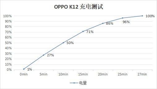 在这次的OPPO K12上,OPPO采用了长寿版100W超级闪充,根据我们实测的数据,OPPO K12从1%开始,5分钟充至27%,10分钟充至50%,15分钟充至71%,20分钟充至86%,仅需27分钟即可充至100%。