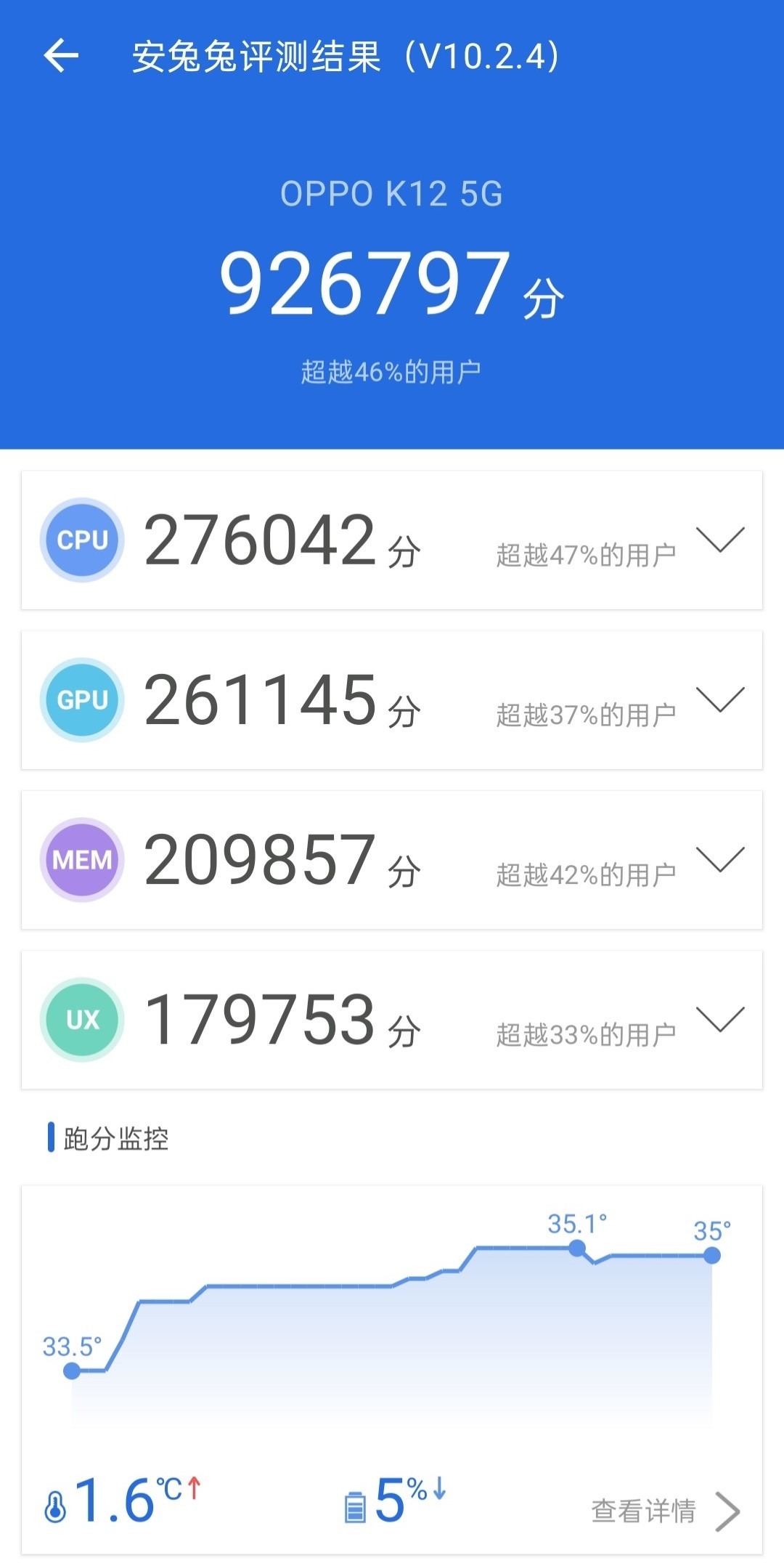 除了搭载高能效的芯片以外,良好的散热也是关键,OPPO K12采用了全新高性能石墨散热材料,石墨总面积达到11147 mm²,有效提升导热性能。其配备了超大旗舰级别大小的4129mm² VC液冷散热片和11颗温度传感器。刚刚给大家展示的安兔兔跑分图中也可以看出,温度上升不明显,并且一直维持在比较低的水平。