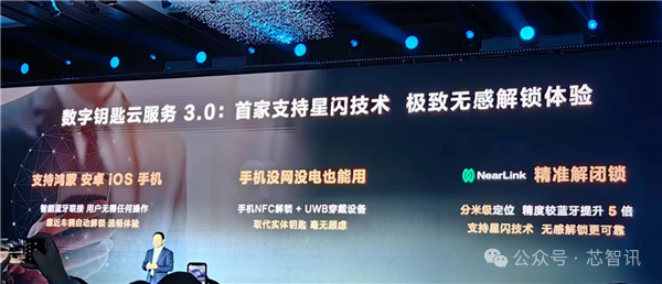 为用户提供全生命周期的体验和服务,其中,数字钥匙云服务3.0,是国内首家支持星闪技术的手机钥匙技术,手机没网没电都能用,定位分米级,精度较蓝牙提升5倍。