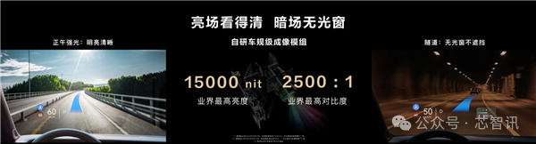 搭载自研车规级LCoS芯片,自研车规级成像模组,以及AR构图引擎,拥有15000nit的业界最高亮度,以及2500:1的业界最高对比度。