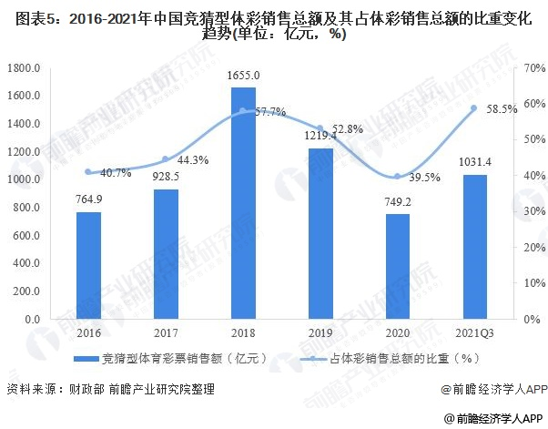 竞猜型体育彩票是传播体育文化,吸引人们关注体育赛事、参与体育运动的重要载体。竞猜型体育彩票,2016年以来,我国竞猜型体育彩票销售额呈现先升后降的走势,到2020年,全国竞猜型体彩销售额为749.2亿元,创近五年新低,占全国体彩总销售额的39.5%。2021年前三季度,全国竞猜体彩销售额快速回升,为1031.4亿元,占全国体彩总销售额的58.5%,发展潜力大。