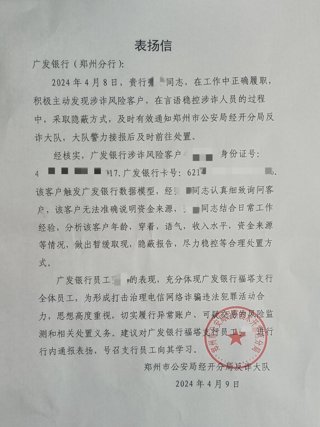 在警银双方的紧密配合下,公安机关迅速采取行动,成功控制该涉诈风险客户。对此,郑州市公安局经开分局反诈大队对广发银行中原福塔支行工作人员的警惕性和协作精神给予了高度评价,发来表扬信,并表示将继续加强与金融机构合作,共同有效打击电信网络诈骗。
