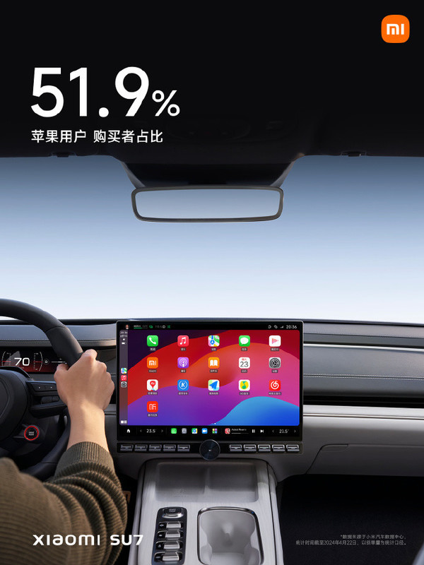 在性能方面,小米SU7在金港赛道的圈速媲美宝马M-power,是50万以内最快车。在小米SU7的车主中,女性购买者占比高达28%,女性车主预计占比40-50%,BBA用户购买者占比29%,苹果用户购买者占比51.9%。虽然苹果不造车,但是小米SU7绝对是对苹果用户支持度最好的车型。