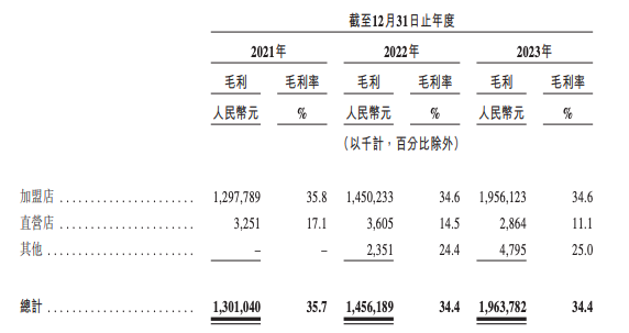 加盟让茶百道赚得盆满钵满。扣除必要的销售成本(货品、设备和培训服务)后,过去三年间,茶百道毛利率均在35%上下(2021年为35.7%,2022年为34.4%,2023年亦为34.4%)。没有了人力等其他高昂成本,余下的不过是分销、行政和研发费用,三项分别占总营收的2.3%、7.4%、0.3%,几乎可以忽略不计。