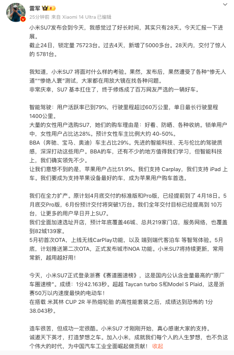 4月25日,小米汽车在北京车展召开发布会。随后,雷军发文称:“截止24日,锁定量75723台。过去4天,新增了5000多台。28天内,交付了惊人的5781台。”