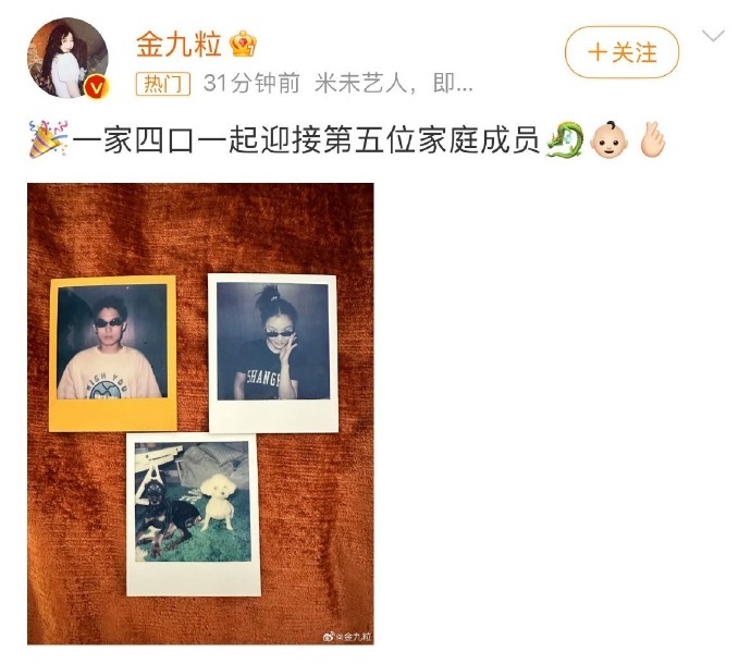 25日,金靖晒自己与男朋友和自家小狗的拍立得照片,并发文:“一家四口一起迎接第五位家庭成员”官宣怀孕。据悉金靖的男朋友舒奕橙是动画编剧、导演,代表作有:《画江湖之不良人》、《风语咒》。金靖曾在2021年被拍到过和舒奕橙一起回家,二人有同款木质戒指,男方的社交平台头像是金靖的狗狗,当时金靖并未否认恋情。金靖发文后,舒奕橙随即点赞金靖官宣微博。不过,金靖什么时候结婚的啊?