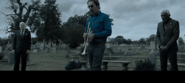 失去理智的雷蒙德愤怒地朝棺材上开了几枪,雷伊则吹奏起了萨克斯。