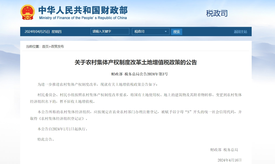 据财政部网站消息,财政部、税务总局近日发布关于农村集体产权制度改革土地增值税政策的公告。