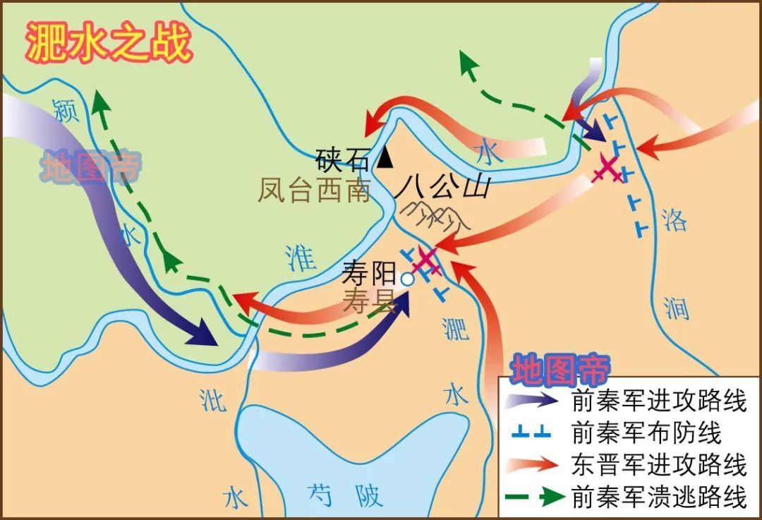 383年(前秦世祖建元十九年、东晋孝武帝太元八年),前秦出兵伐东晋,战于淝水(今安徽淮南寿县)。前秦军号称八十余万大军,投鞭断流;东晋七万余精锐,八公山上,草木皆兵。东晋幸运地以少胜多,前秦苻坚军大败,败退途中还风声鹤唳,至洛阳时仅剩十余万人马。