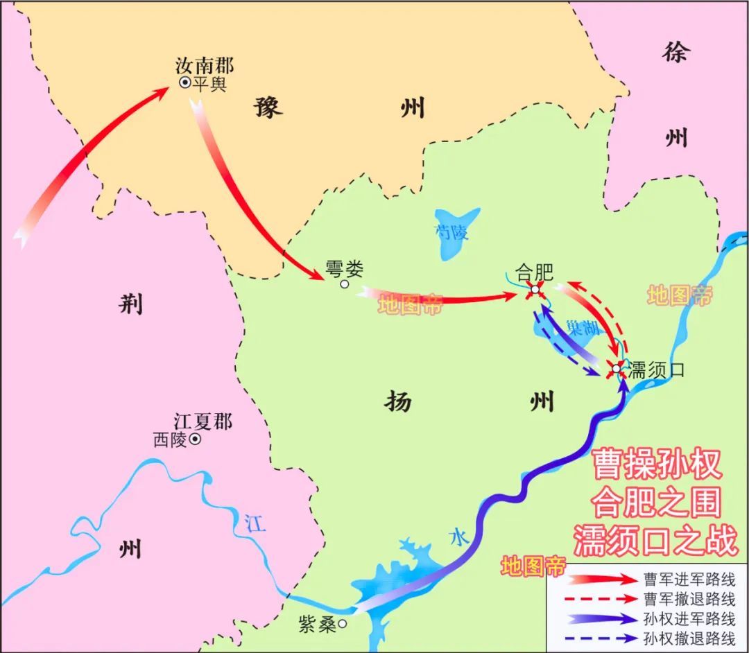 江淮地区水网密布,又分为东西两部分,西部寿春-合肥这条线,是北方势力南下的主要路线之一,也是南方防御的核心地区。