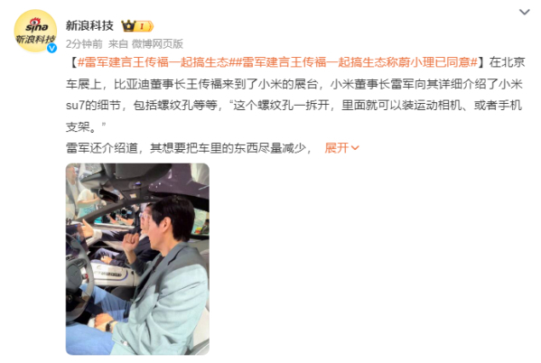 此外,雷军北京车展也去了比亚迪汽车展台,与王传福握手交流。在现场,雷军表示,十几年来,比亚迪都是小米手机非常重要的合作伙伴,现在小米汽车也是。雷军还体验并高度称赞了比亚迪旗下的方程豹汽车:“一看名字就很霸气,一定是爆款!”